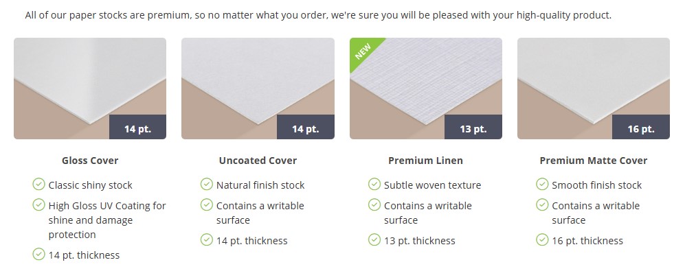 - Choose our 14 pt. Gloss Cover for a beautiful shine, the 14 pt. Uncoated Cover for a textured look, or one of our Matte stocks for a more subdued and vintage look. We are also now offering Trifecta triple-layered paper!