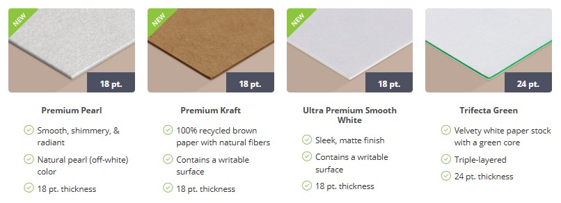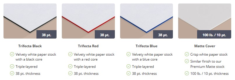 - Choose our Gloss stock for a beautiful shine or one of our Matte stocks for a more subdued and vintage look. For truly luxurious cards, we’re now offering our Trifecta ultra thick, triple-layered paper!
