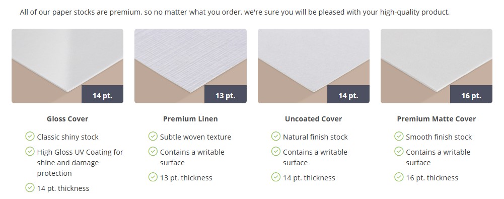• Choose our Gloss stock for a beautiful shine or the 14 pt. Uncoated Cover for a textured look to your folder.