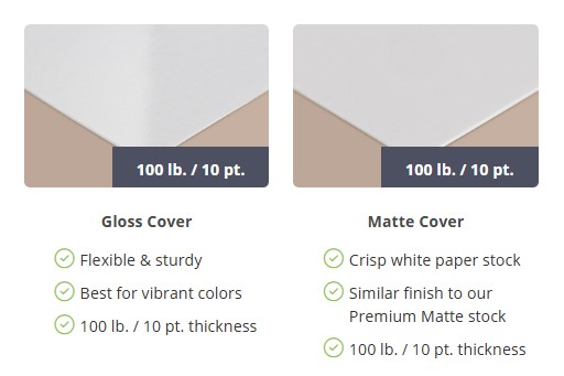 • For the 14 pt. Gloss Cover, a High Gloss UV Coating will be applied to the Front (outside) only. High Gloss UV Coating makes the products more durable, so your folders will last longer. You cannot write or print on products with High Gloss UV Coating.