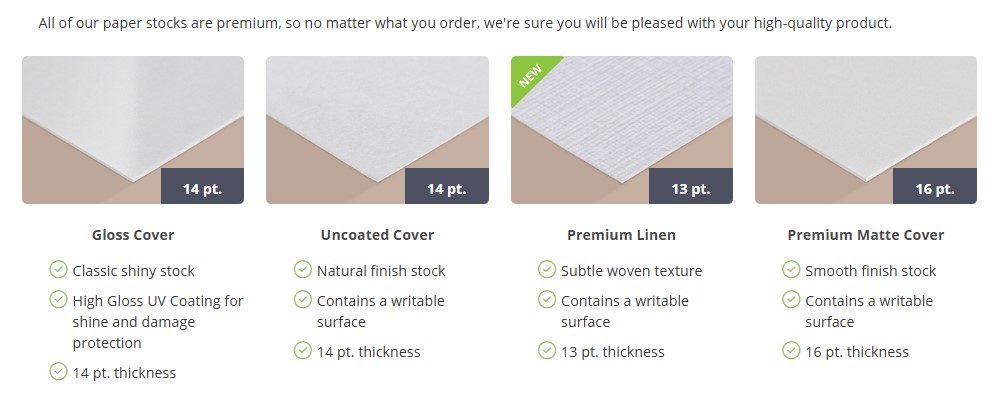 • Choose our Gloss stock for a beautiful shine, the 14 pt. Uncoated Cover for a textured look, or one of our Matte stocks for a more subdued and vintage look. Or try our Trifecta ultra thick, triple-layered paper for a luxurious look and feel.